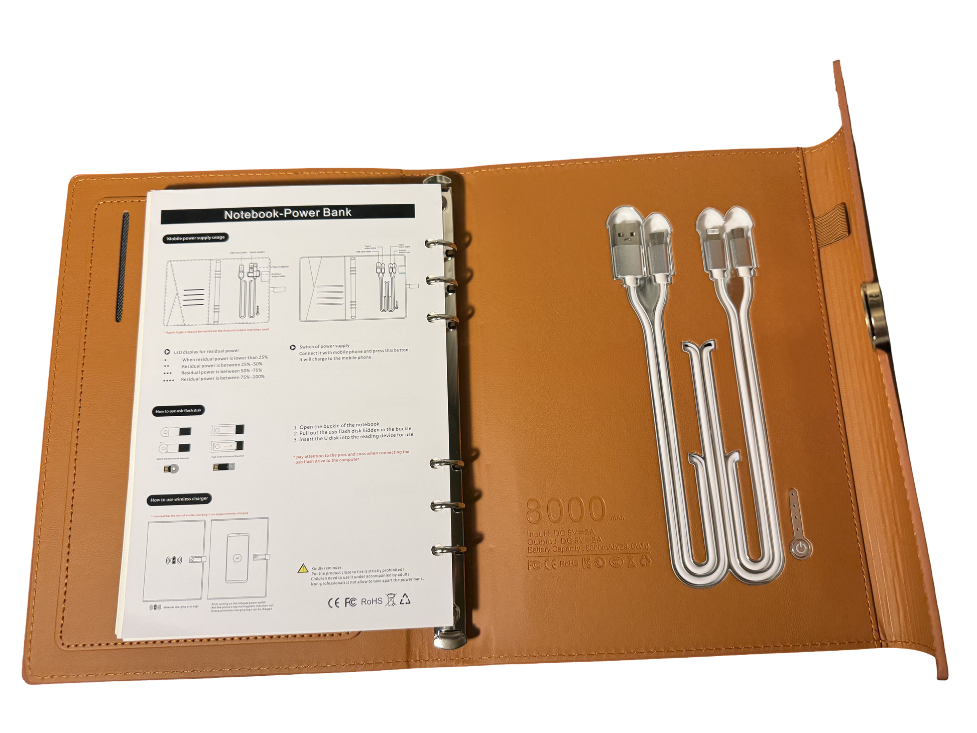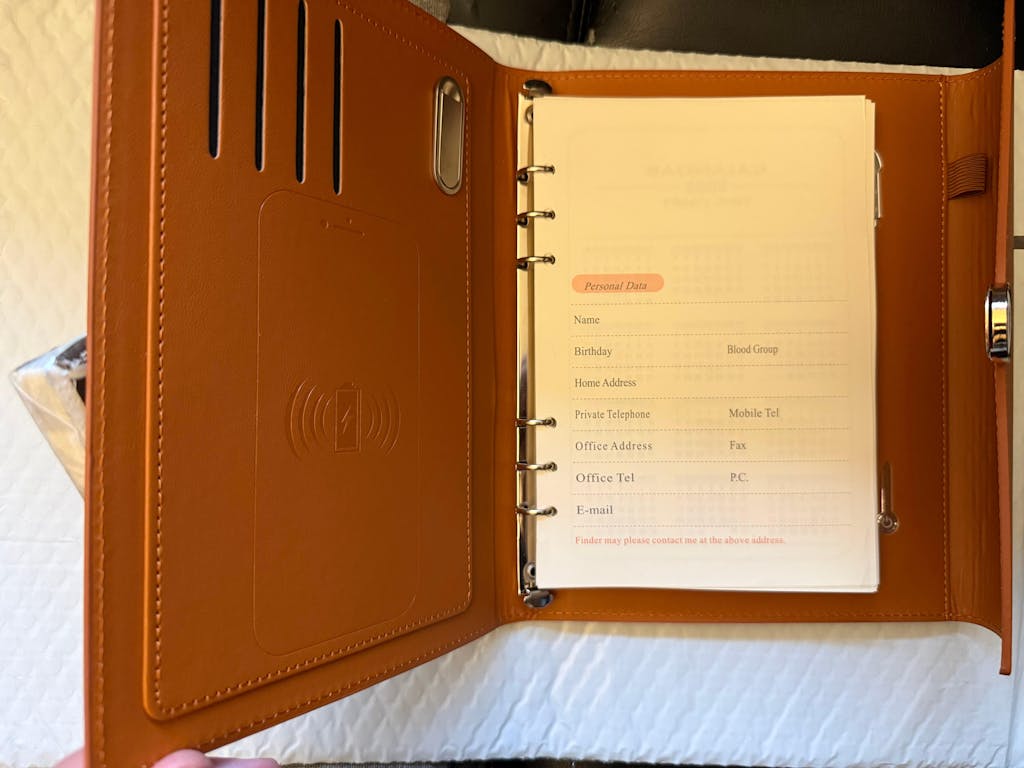 a premium clutch-style A5 notebook that combines smart organization with built-in power. Featuring an 8000mAh wireless power bank, 3-in-1 charging cable, and USB flash drive, it’s designed for business, travel, and everyday productivity in one sleek carry-all.
